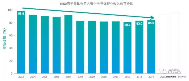 这种大规模的频繁交易是否真的能够给半导体行业带来一家独大的局面?Wally认为,虽然2015年,2016年并购的数量很多,总额很高,但并不意味着全球半导体企业最后会合并成一家公司,事实上,整个半导体行业正呈现“分散化”:截至2014年,在过去的十年当中,前50强半导体公司的联合市场份额10年来 下降了15个百分点,仅为84%,但基于最近的兼并活动,分散的比例有所降低。