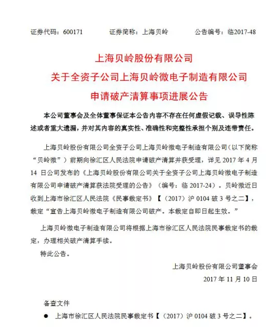 上海贝岭微电子制造有限公司宣告破产
