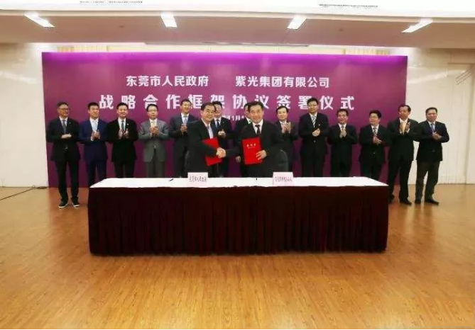 11月15日,紫光集团与东莞市人民政府签订战略合作框架协议,紫光集团拟在东莞投资1000亿元,建设紫光集团芯云产业城项目暨“紫光集团华南区总部项目”。东莞市委书记、市人大常委会主任吕业升,市委副书记、市长梁维东,市委副书记张科,市委常委张冠梓,紫光集团董事长赵伟国等双方领导出席签约仪式并见证签约,梁维东市长与紫光集团联席总裁王慧轩签约。