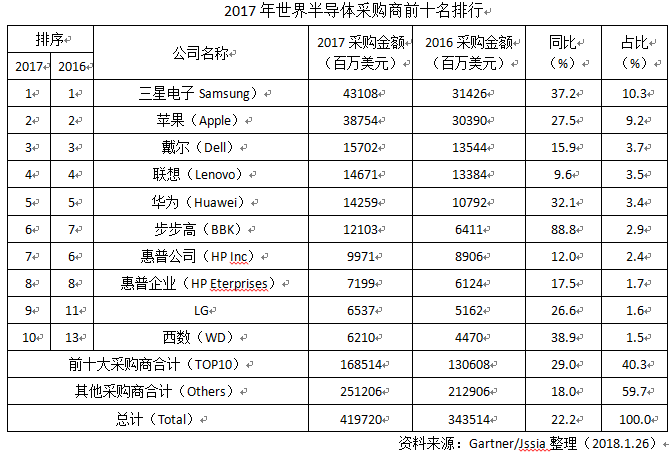 2017年世界电子信息整机前十大厂商对半导体器件采购企业总值同比增长29%,较2016年同比增长23.8%个百分点,发展速度可为历史最好水平。其中:同比增长达两位数以上的企业有9家,占90%。按增长率大小排序,分别是:步步高、西数、三星、华为、苹果、LG、惠普企业、戴尔、惠普公司等,联想以增长9.6%的增长率位居第十位。其中步步高同比大增88.8%,居前十大企业增长率之首;美国西部数据以同比增长38.9%,三星电子以同比增长37.2%,分居第二、第三位;紧随其后的是华为,同比增长32.1%,居第四位;苹果以同比增长27.5%居第五位。