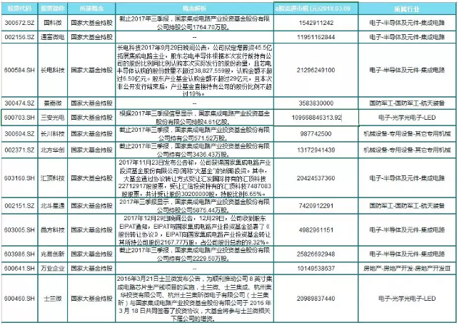 这意味着,从国家层面来看,对集成电路产业的扶持力度更大,地方政府的基金平台响应呼声也将会更高。而自国家大基金成立以来,在A股市场上进行密集型投资后,已经形成国家大基金概念股。