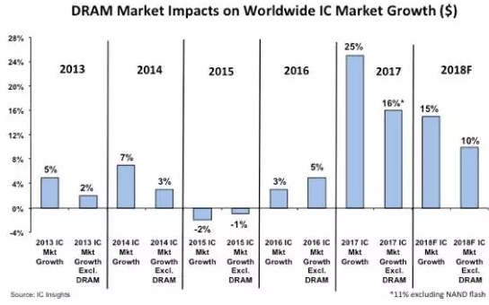 报告称,2018年DRAM市场的整体规模预料会达到996亿美元,比NAND的621亿美元大幅超出375亿美元,成为IC业界规模最大的产品类别。从该机构制作的图表可以看出(见左图),过去五年来,DRAM已成为左右全球IC成长的关键因素。
