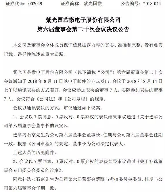 紫光国微公告称,公司第六届董事会第二十次会议于8月14日上午以通讯表决的方式召开,会议审议通过《关于选举公司第六届董事会董事长的议案》,选举刁石京先生为公司第六届董事会董事长,任期与公司第六届董事会任期一致。根据规定,董事长为公司法定代表人。