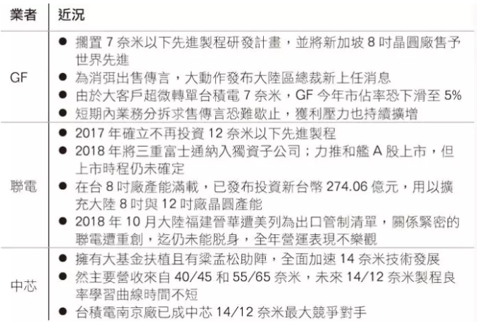 如全球第二大晶圆代工厂格芯,在不敌台积电投资黑洞后,过去一年来陆续揭露调整计划,包括更换执行长、启动裁员计划及暂停成都12吋晶圆厂一期投资计划;而最受关注的搁置7纳米以下先进工艺研发计划,以及将新加坡8吋晶圆厂售予世界先进,一连串举动也使得格芯出售传言甚嚣尘上。