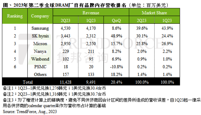 根据TrendForce集邦咨询发布的数据,2023年二季度DRAM产业营收约114.3亿美元,环比增长20.4%,终结连续三个季度的跌势。