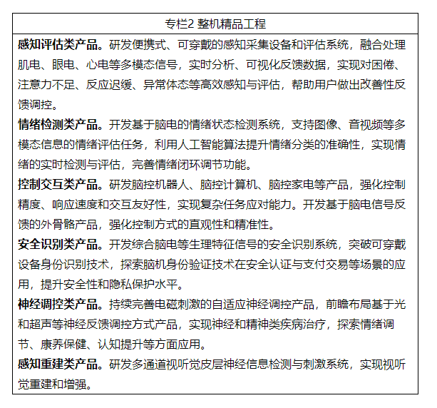 (十六)加强政策支持。加强脑机接口技术攻关和应用示范,推动布局实施一批重大项目,强化协同攻关能力。推动国家制造业转型升级基金、国家中小企业发展基金等加大投入,实施“科技产业金融一体化”专项,发挥国家产融合作平台作用,带动更多资本投入。对植入式脑机接口医疗器械等重点产品加大注册指导,给予优先支持。用好首台(套)、首批次保险补偿政策,加快产业化落地。